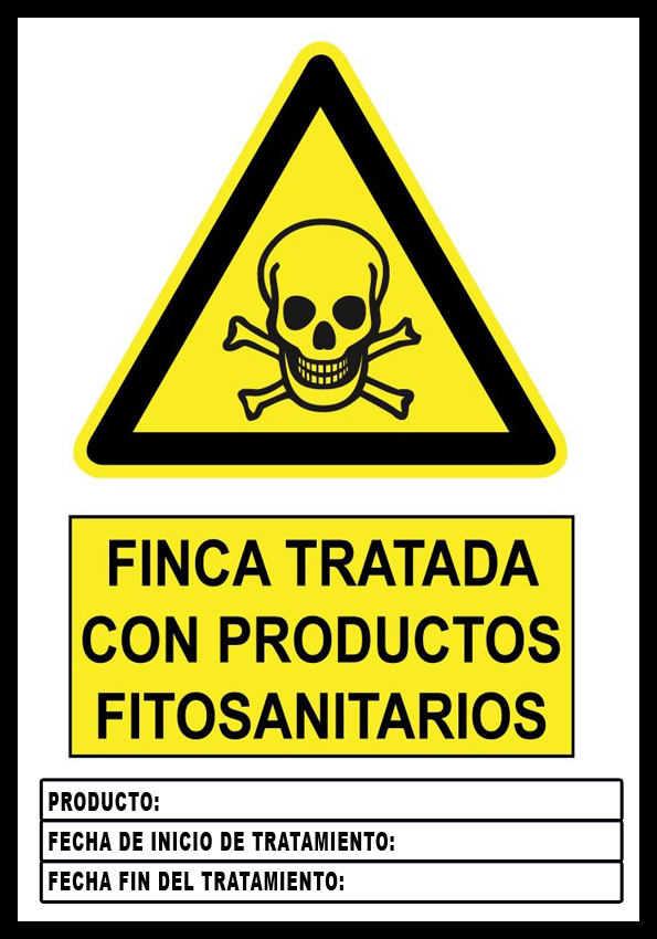 Cartel para señalización e indentificación de fincas tratadas con productos fitosanitarios segun marca la ley que regula dicha actividad, la cual obliga a identificar y avisar que la finca esta siendo tratada con dichos productos.